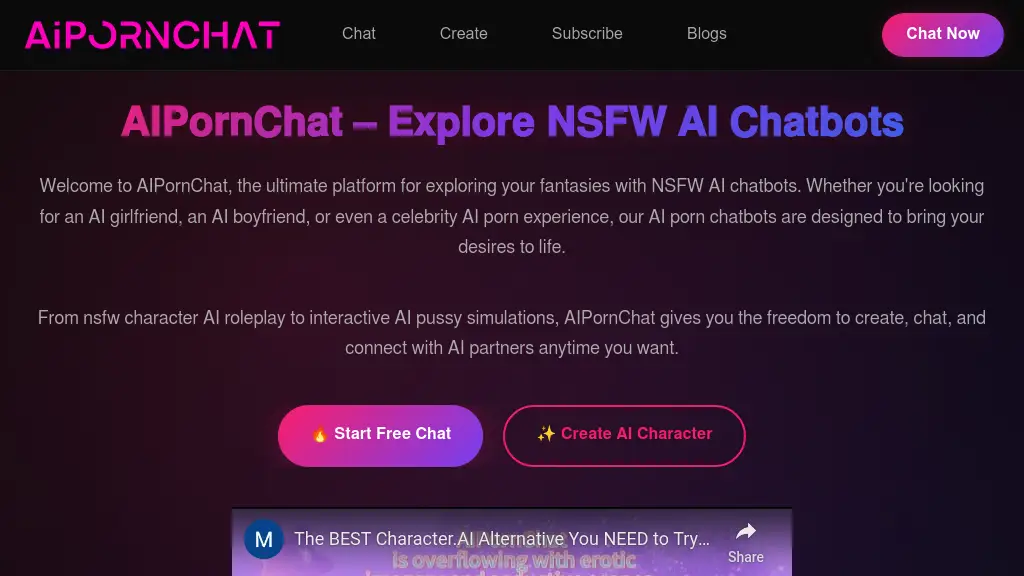 I tested AIPornChat and found it surprisingly engaging for a chatbot experience. The platform boasts over 50 categories, which cover a wide range of interests, ensuring there's something for just about everyone. The AI characters are pretty responsive, and I enjoyed the customizability in conversations. One of the standout features is the option for 1080p visuals, which is great when you're looking for quality. I noticed that the updates happen three times a week, keeping the content fresh and relevant. This is a definite plus if you're into new experiences often. That said, there are limitations. The interaction can sometimes feel a bit scripted, especially if you’re diving into deeper conversations. While the visuals are nice, I found that not all characters displayed the same level of detail, which might disappoint those looking for ultra-realistic portrayals. Overall, AIPornChat is worth checking out if you're curious about AI-driven adult chat. Just keep in mind that you might hit a few bumps in conversational depth along the way.