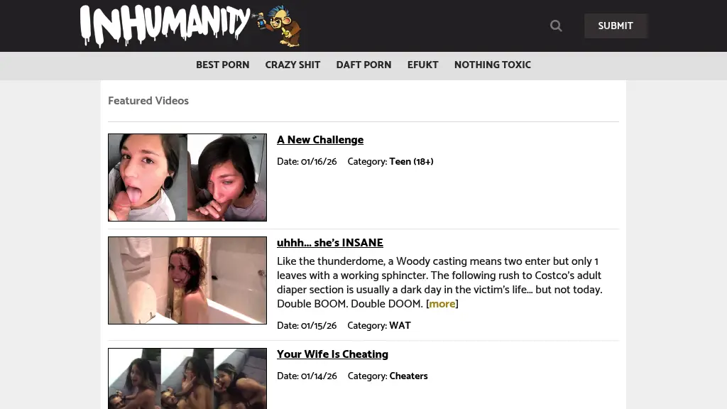 I tested Inhumanity and found it to offer a solid variety of adult content, especially in the Funny category. With over 50 categories, there’s something for everyone, whether you're into parodies or more risqué humor. The video quality is pretty impressive, featuring options up to 4K, and I enjoyed watching in 1080p without any buffering issues. What caught my attention was the frequent updates—three times a week! This keeps the content feeling fresh and gives users a reason to check back regularly. I appreciated the ease of navigation, making it simple to find new material that fits my tastes. One limitation I noticed, though, is that some videos lack detailed tags, which can make it harder to sort through specific themes. While the content quality is great, finding exactly what I wanted sometimes took longer than expected. Overall, Inhumanity stands out for its variety and quality, but a bit more organization would enhance the experience.