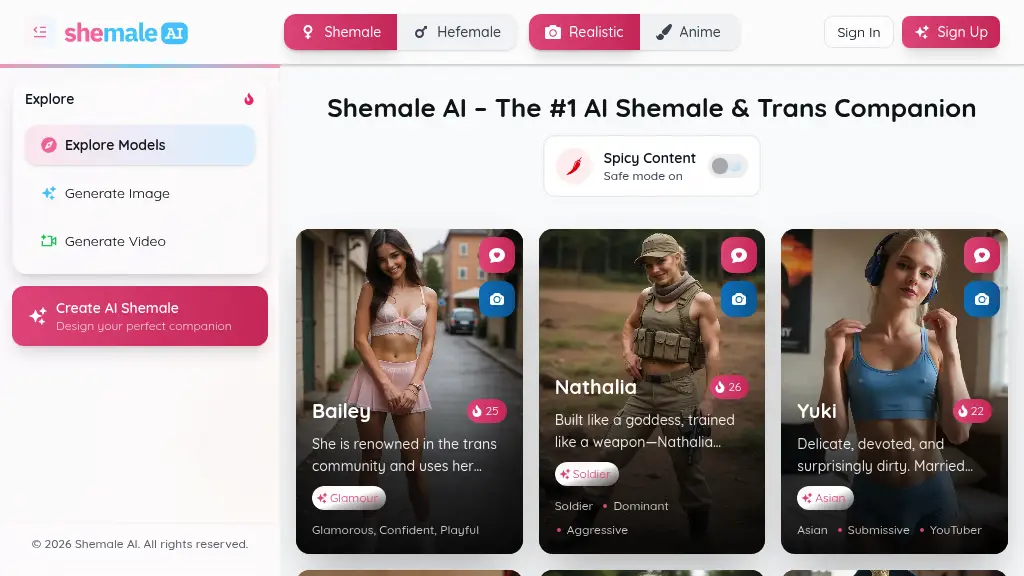 I tested the Shemale AI platform and was pleasantly surprised by how realistic the interactions felt. The chat interface is smooth, making it easy to engage with the virtual companions. I specifically enjoyed the variety, as there are over 50 categories to choose from, allowing for a customized experience that suits different preferences. In terms of visuals, the 1080p image quality is impressive, and I found the video generation feature quite entertaining. They update their content three times a week, which keeps things fresh and appealing. It’s nice that you can create your own model—definitely a unique touch! However, I did notice that while the chat can be very engaging, sometimes the responses felt a bit generic and could use more personalization. This is a limitation if you’re looking for deep, meaningful conversations. Overall, I think it's a fun platform to explore for anyone curious about AI companions. Just keep in mind the chat’s occasional lack of depth while enjoying the visuals and variety it offers.